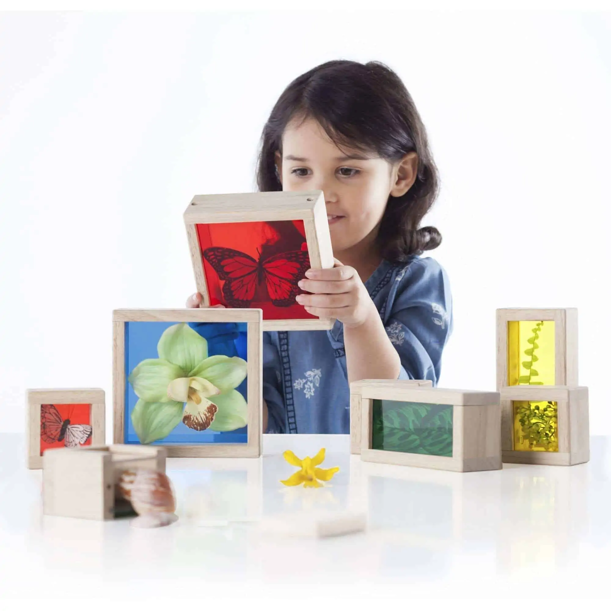 Die Treasure Blocks sind kleine Schaukästen zum Spielen: Kinder befüllen die Holzrahmen mit Acrylfenstern mit Perlen, Naturmaterialien, Mini-Objekten u. v. m. und beobachten ihre Sammlung von allen Seiten. Das abnehmbare Panel wird mit zwei Schrauben sicher geschlossen – perfekt für Präsentation, Vergleich und Farbexperimente am Lichttisch oder am Fenster. Das 8-teilige Set in Clear oder Primary lädt zu offenen Lernaktivitäten in Kita, Vorschule und Zuhause ein.