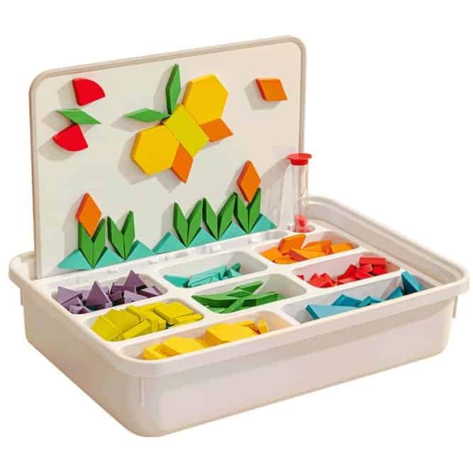 - Inhalt: 250 Teile (8 Formen), Magnettafel, Marker, Sanduhr, Heft, Sticker, Zertifikat, Box