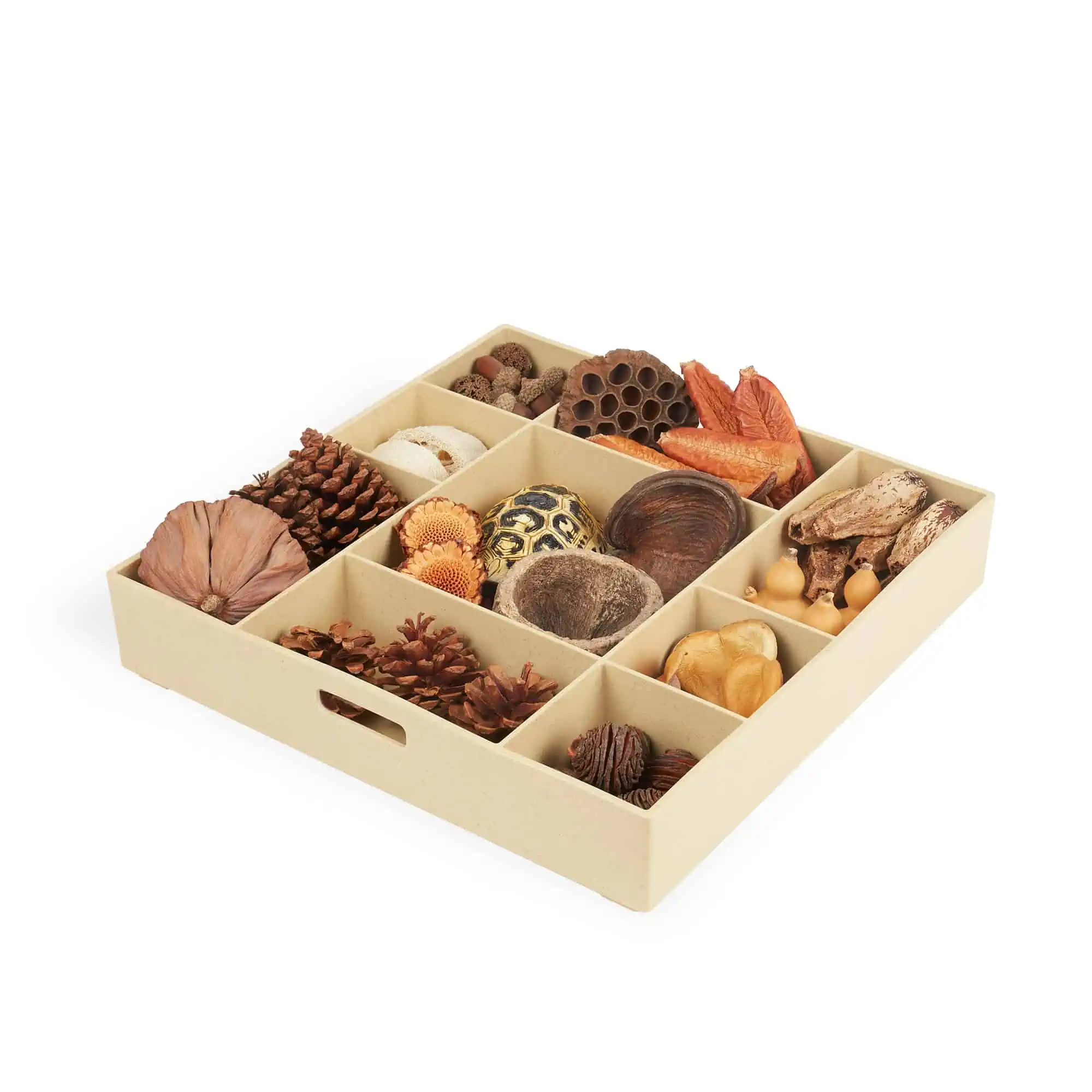 Entdecken, sortieren, konstruieren: kuratierte lose Teile (z. B. Samenkapseln, Zweige, Luffa) im Poly+ Fach-Tablett. Texturen & Muster erforschen, abwischbar. Ab 3+.
