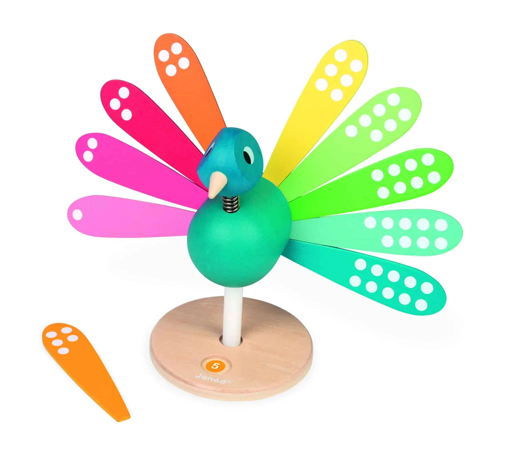 Ein hübscher, bunter Pfau zum Erlernen der Zahlen! Der Sockel dreht sich und bleibt auf einer beliebigen Zahl stehen. Das Kind muss nun versuchen, die Feder passend zu dieser Zahl am Pfau zu finden und zu entfernen. Die Federn können beidseitig benutzt werden für 3 Schwierigkeitsstufen: Farben finden/Zahlen finden/Punkte zählen.