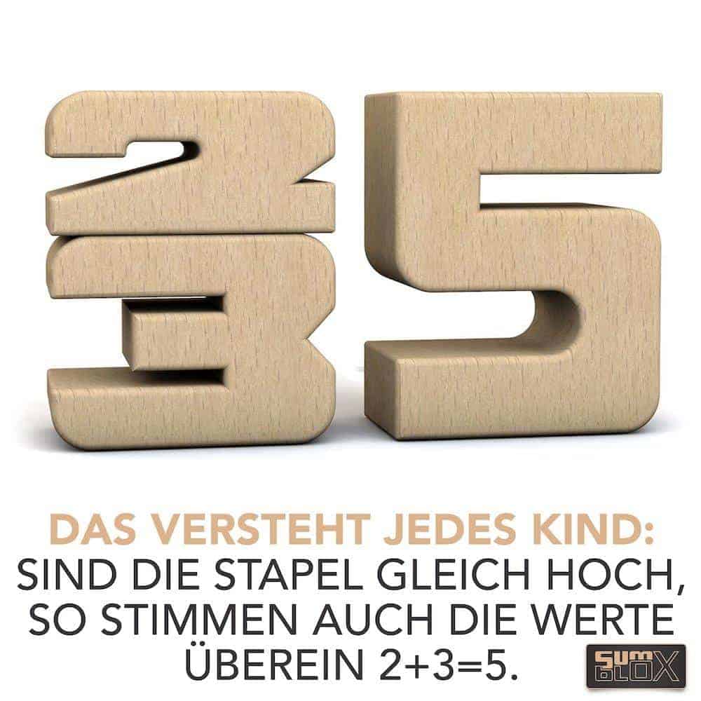 Mit Sumblox kannst du dich selbst beim Rechnen kontrollieren, indem du einfach die Höhe der Zahlen vergleichst. Aber nicht nur Summen sind mit den Sumblox möglich. Du kannst auch Multiplikation, Division und Brüche mit ihnen darstellen. Wenn du das Rechnen mit Sumblox erlernst, brauchst du nur wenig Anleitung und entwickelst ein starkes Selbstvertrauen im Umgang mit Zahlen, das beim Lernen auf Papier leider meist auf der Strecke bleibt. Vor allem Kinder mit Rechenschwäche können von der Visualisierung der Zahlen und dem intuitiven, spielerischen Umgang mit ihnen besonders profitieren.