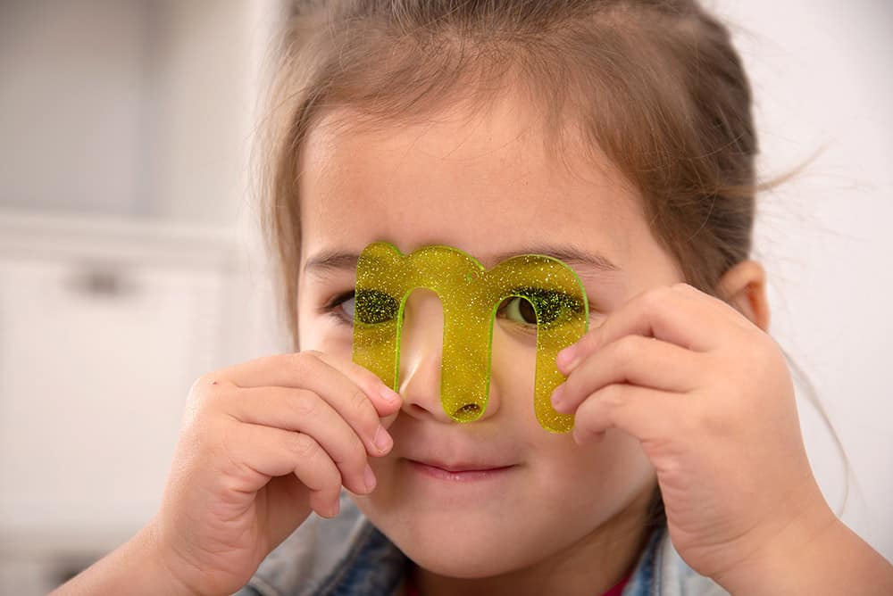 Lerne lesen und schreiben mit den glitzernden Buchstaben in Regenbogenfarben.