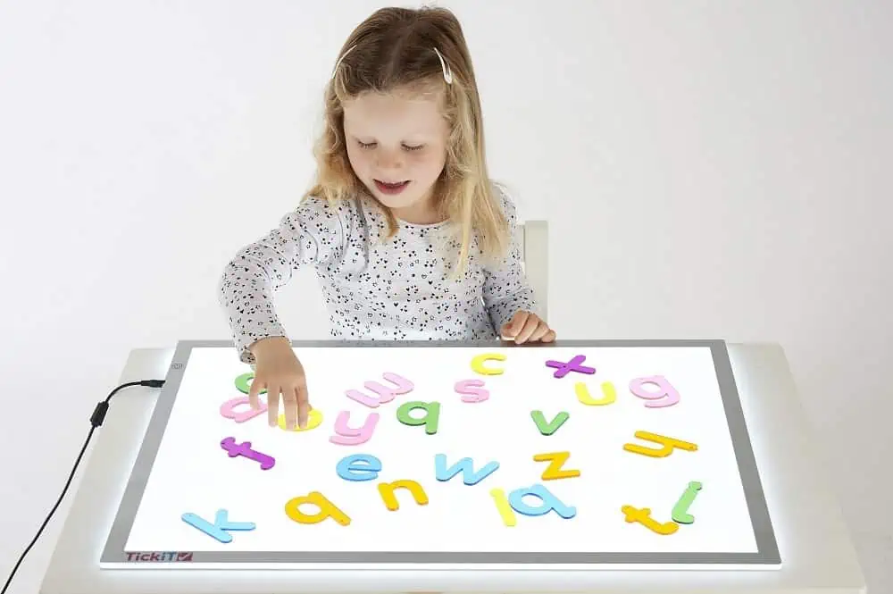 Lerne lesen und schreiben mit den Buchstaben in Regenbogenfarben. A3 Light Panel separat erhältlich.