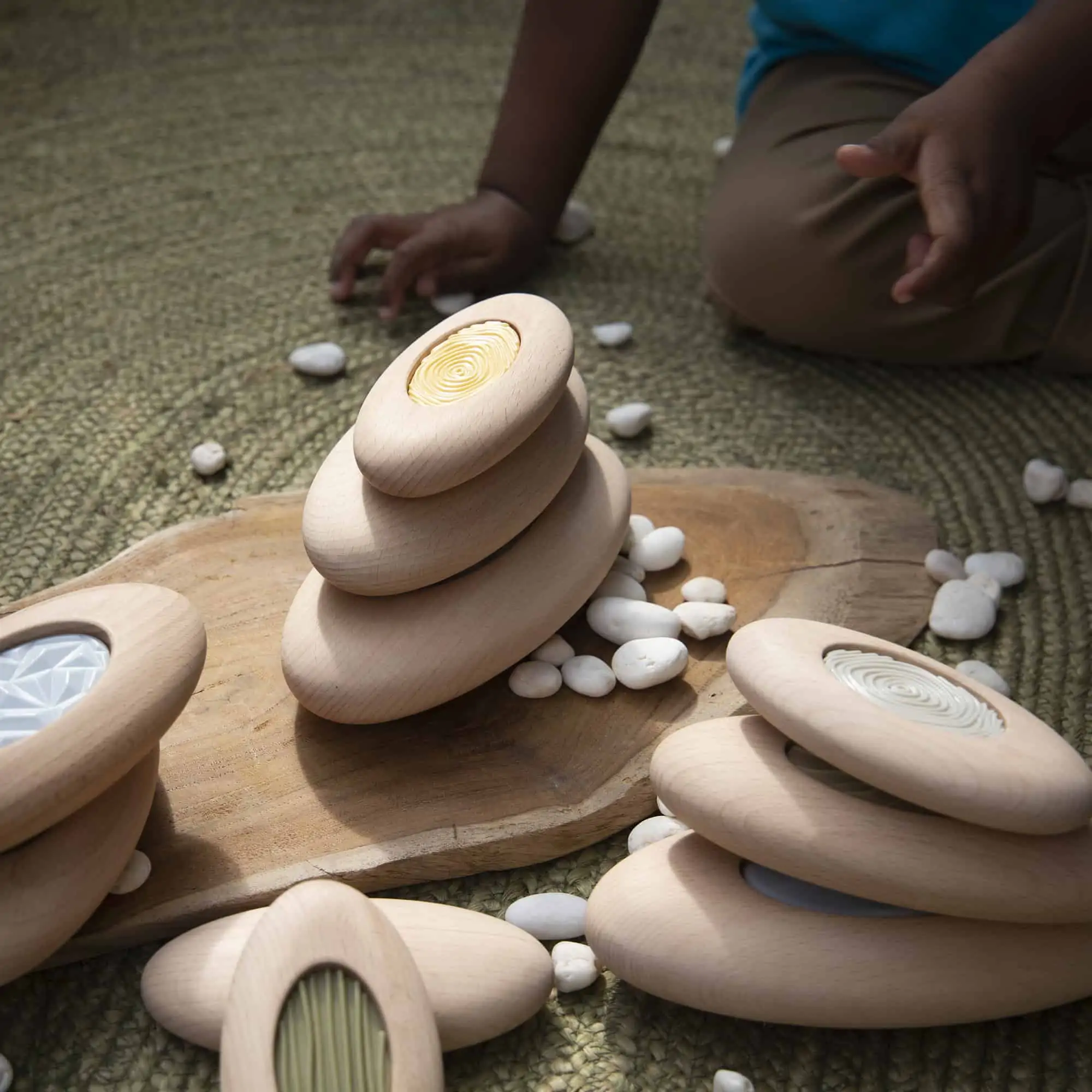 Tasten & balancieren: 10 übergroße Holz-Steine mit strukturierten Inlays. Muster legen, Türme bauen, Feinmotorik stärken. Größen 13–19,5 cm Breite. Ab 2+.