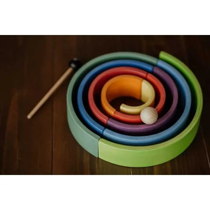9 bogenförmige Holzelemente aus finnischem Furniersperrholz in Regenbogenfarben zum Stapeln, Bauen, Sortieren und mehr.