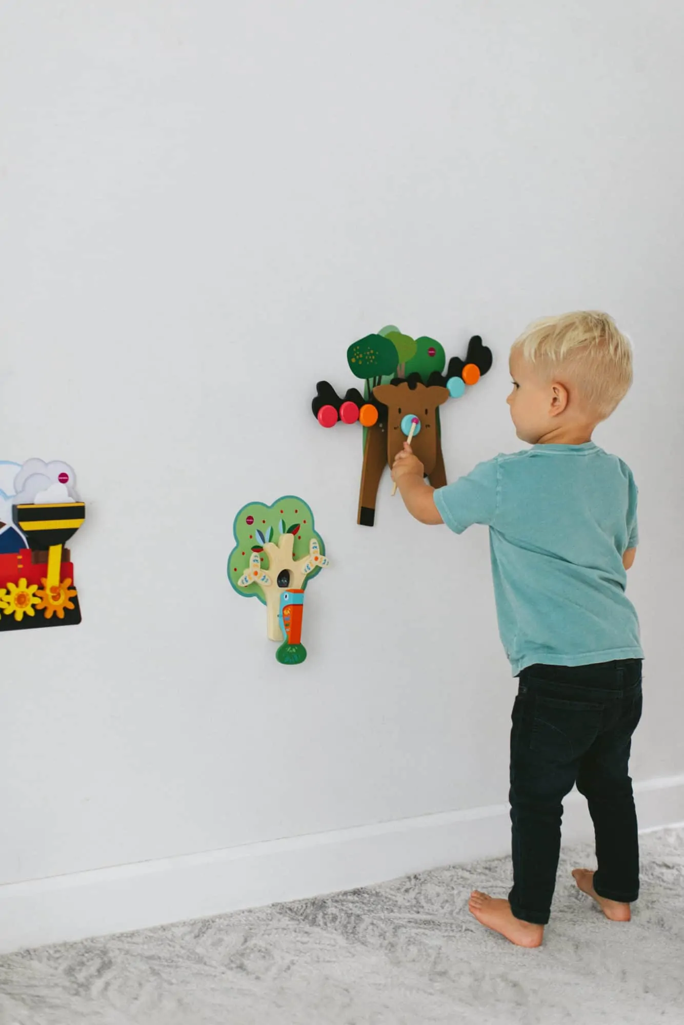 Sei vorsichtig, denn der Elch schüttelt sich die Hörner ab! Platziere die magnetischen Scheiben auf dem Geweih des Elchs, aber achte darauf, dass du das Gleichgewicht hälst!
