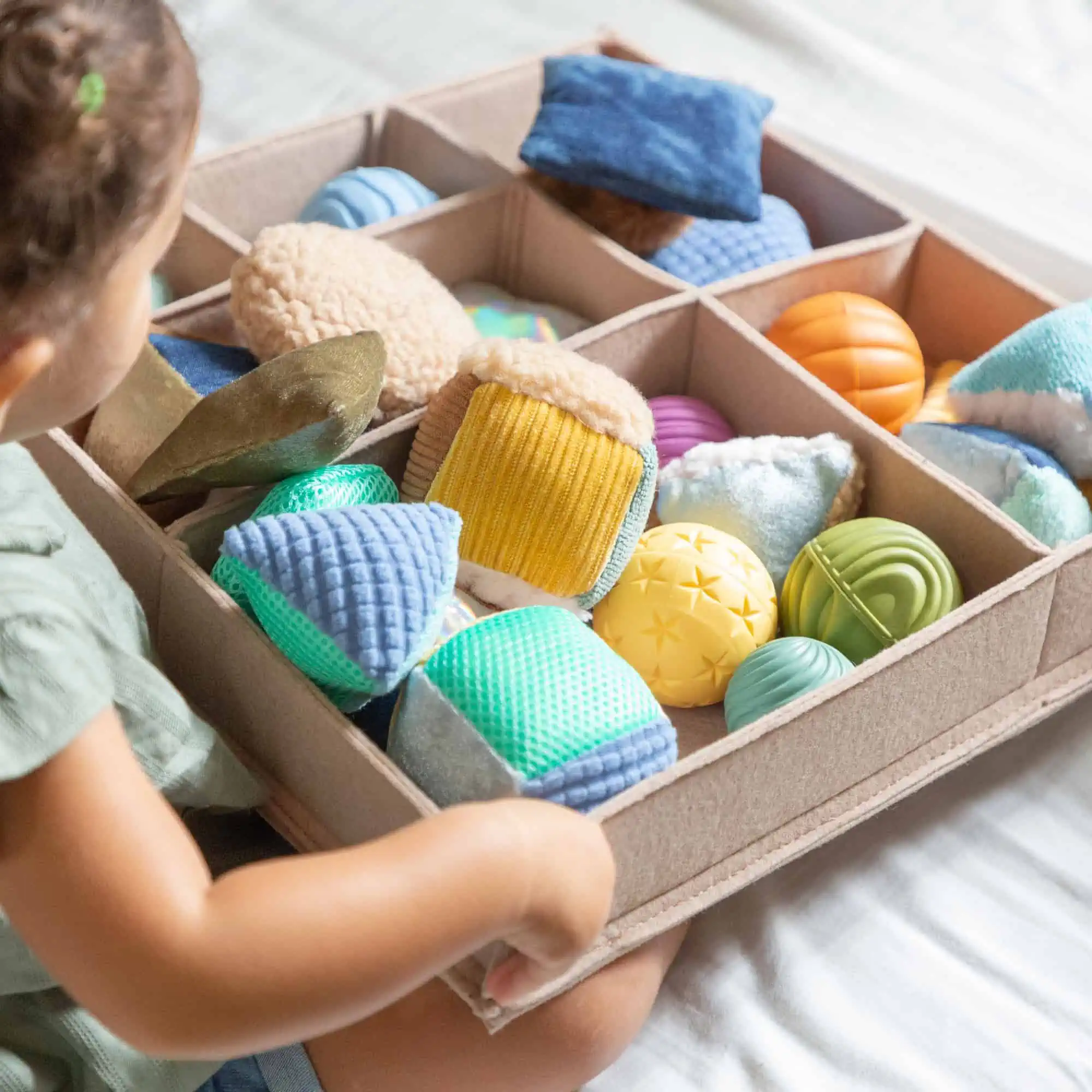 - Materialmix: Plüsch-Formen (u. a. Mesh, Chenille, Denim, Fleece, Samt) · strukturierte Bälle · Fach-Tablett aus Filz (unterteilt)