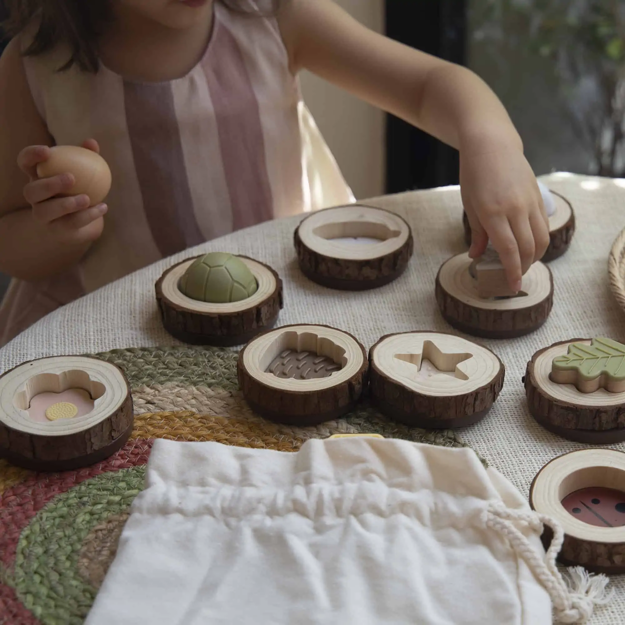 • Setumfang: 24 Teile (passende Natur-Formen + große Holzscheiben) · Canvas-Beutel zur Aufbewahrung