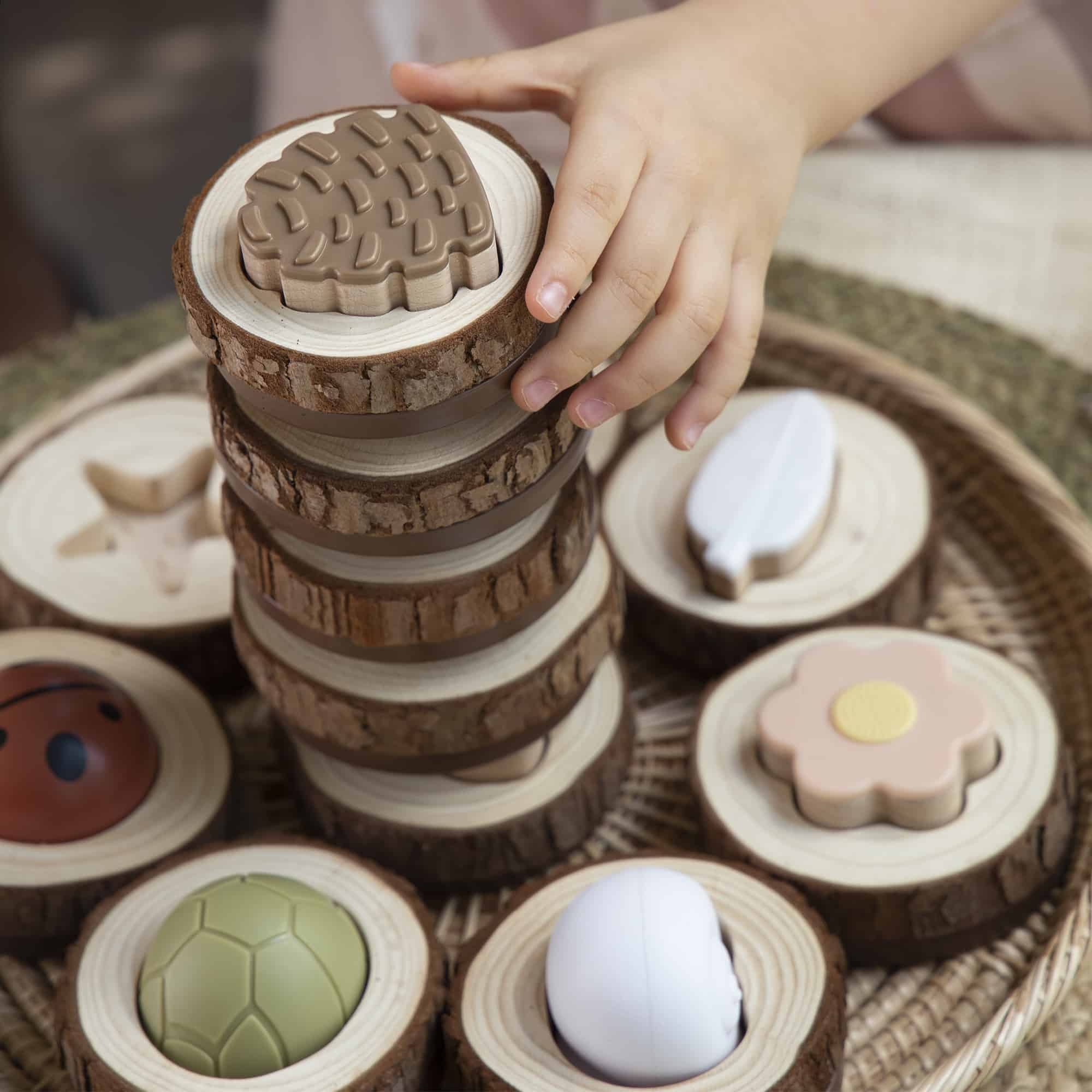 - Setumfang: 24 Teile (passende Natur-Formen + große Holzscheiben) · Canvas-Beutel zur Aufbewahrung