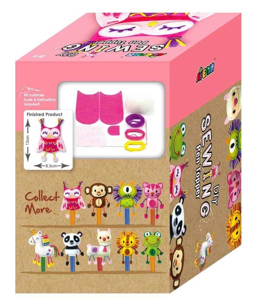 Die „Sewing“-Reihe von AVENIR lässt dich dein eigenes Kuscheltier nähen. Diese niedlichen Tiere (und auch das schreckliche Monster) sind so klein, dass sie auf jeden Stift passen. Alles, was du brauchst, ist bereits im Set enthalten. Du findest Filzteile und Stoffe, Füllung, verschiedene Fäden, eine Nähnadel aus Kunststoff und eine Anleitung mit Abbildungen. Jedes Set ist für Kinder ab 5 Jahren geeignet.