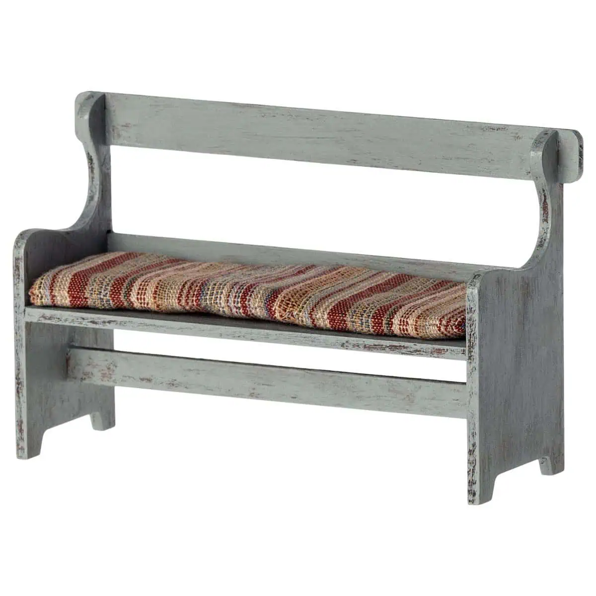 Die Maileg Holzbank im Vintage-Stil ist ideal für die Mäusefamilie. Mit einem weichen Kissen für gemütliches Sitzen und handgefertigten Details.