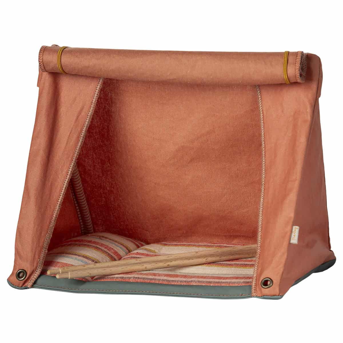 Das Maileg Happy Camperzelt für Mäuse sorgt für Outdoor-Abenteuer. Mit beschichtetem Stoff für authentischen Look, Holzstäben zum Fixieren der Tür & gemütlichem Platz zum Übernachten.