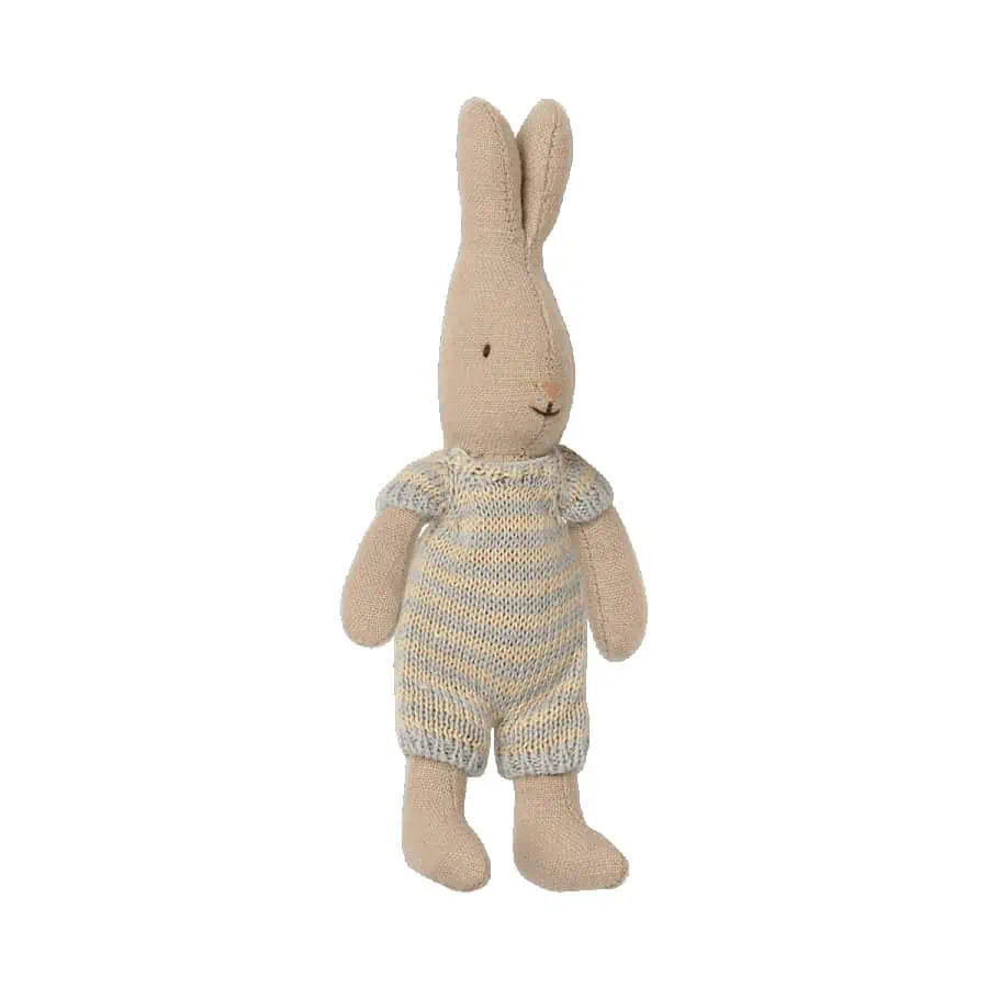 Ein entzückendes Mikro Kaninchen, gekleidet in einen gestreiften Anzug aus Baumwolle/Leinen, perfekt für Fans jeden Alters. Erhältlich in drei Farbkombinationen.