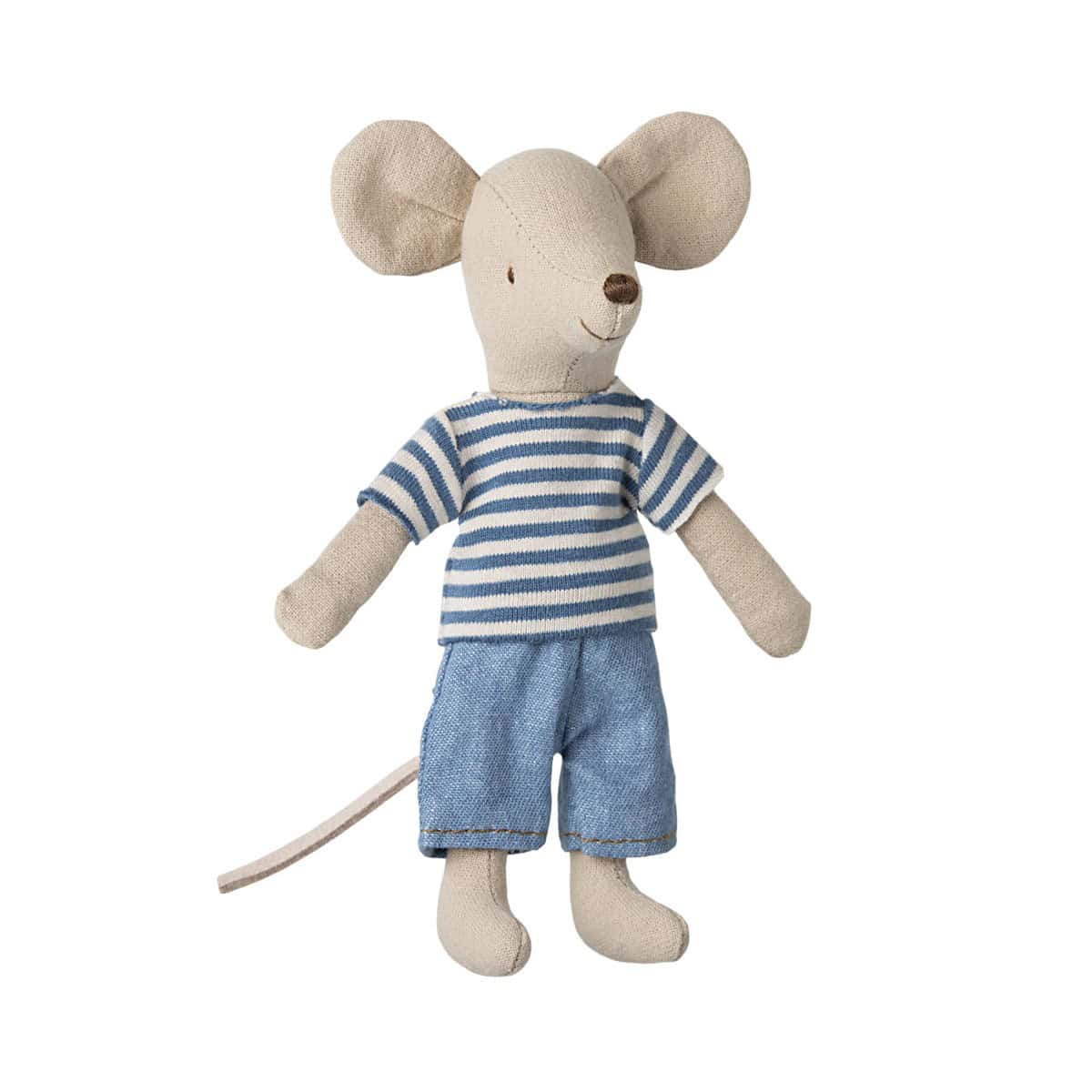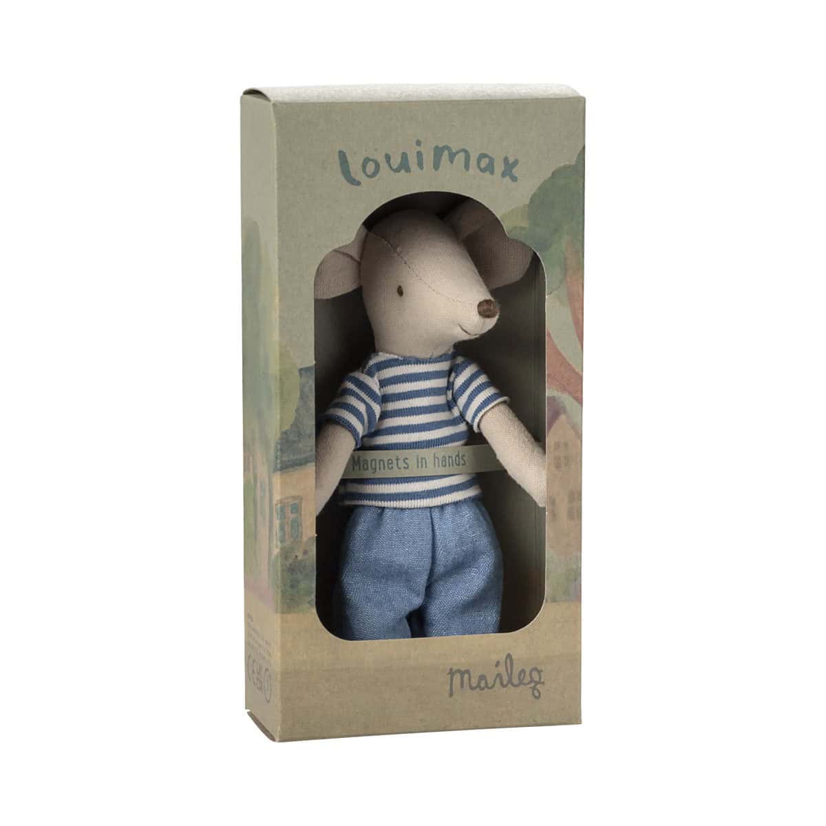 Maileg LouiMax – Der abenteuerlustige große Bruder trägt ein gestreiftes Shirt und Jeanshose. Mit Magneten in den Händen und in einer stilvollen Box verpackt. Für Kinder ab 3 Jahren geeignet.
