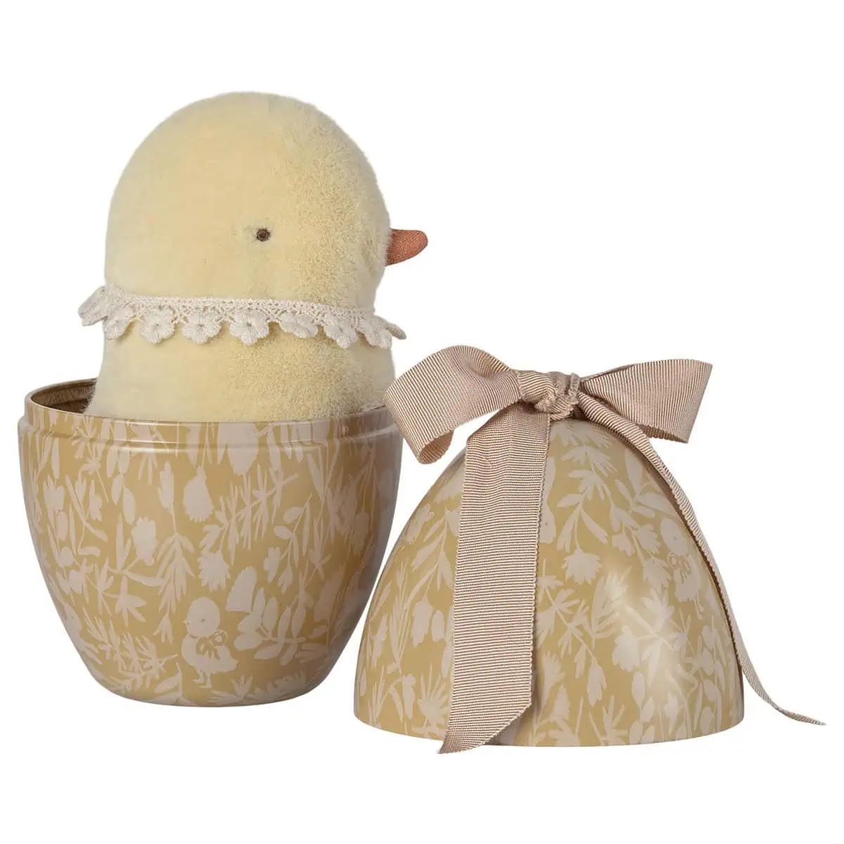 Das Maileg Osterei mit einem weichen Plüschküken ist eine zauberhafte Osterüberraschung. Das Metallei mit schönem Muster und Schleife macht es zum perfekten Geschenk oder Dekorationsstück.