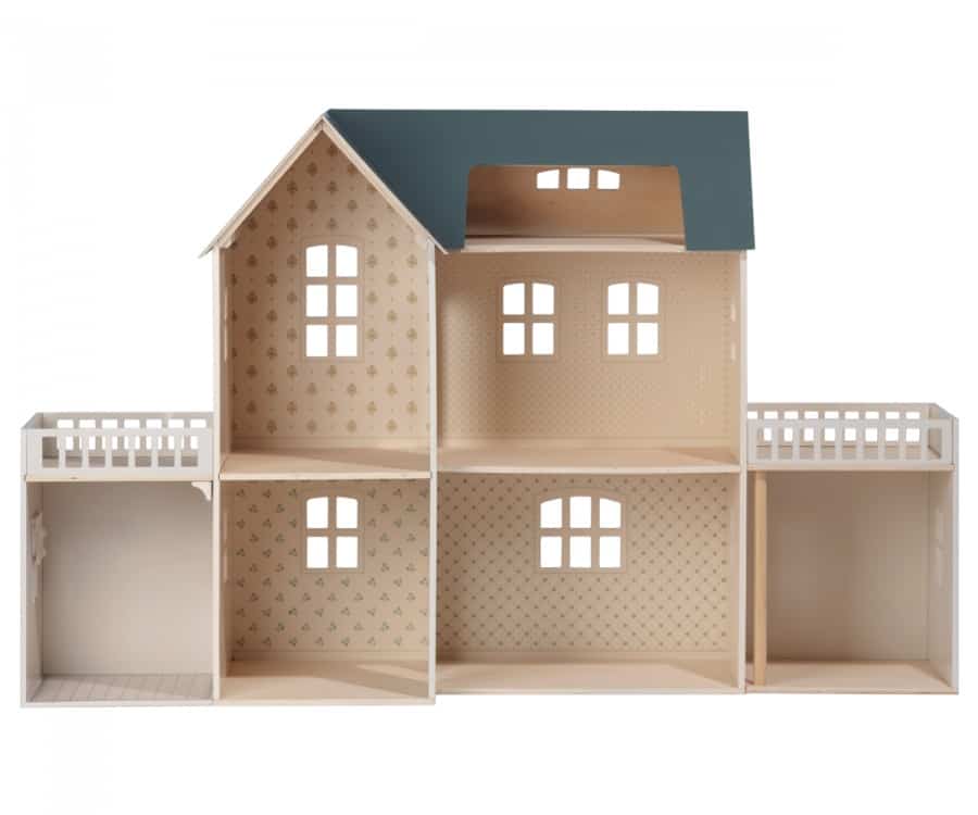 Mit diesem Puppenhaus bietest du deinen Maileg Mäusen und Hasen ein gemütliches Zuhause. Insgesamt 5 Zimmer erwarten dich auf 2 Etagen inklusive Dachgeschoss. Pro Etage gibt es jeweils zwei Zimmer. Auch im Dachgeschoss findet sich ein kleines Räumchen. Jedes Zimmer verfügt über ein Fenster an jeder Außenwand. Damit haben deine Hausbewohner immer genug Licht. Das Haus besteht aus FSC-zertifiziertem Holz und hat die Maße 80 x 72 x 40 cm.