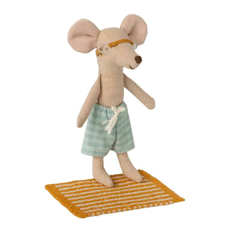 Kleines Strand-Set mit allen wichtigen Accessoires für einen Tag am Meer: Badehose, Handtuch und Taucherbrille. Passt perfekt zu den Mäusen Großer Bruder/ Große Schwester von Maileg.