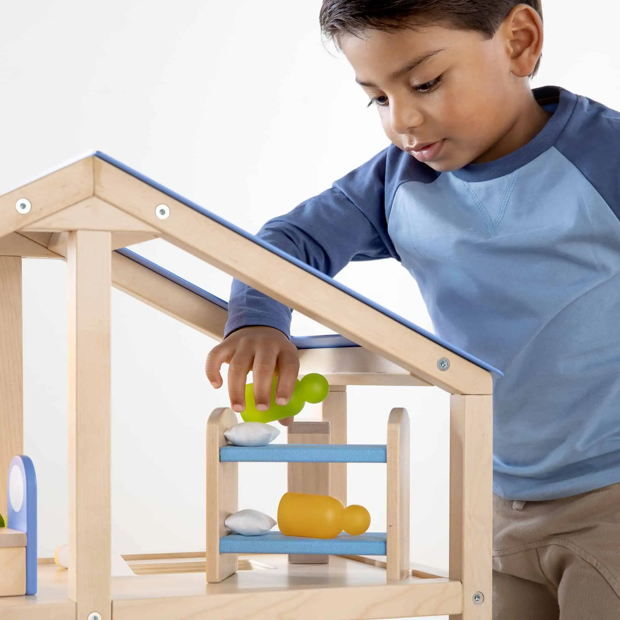 Das Modern Home Dollhouse bringt klare Formen und freundliche Farben ins Rollenspiel. Die Konstruktion aus Massivholz + Sperrholz ist langlebig; farbige Acryl-Akzente lassen Licht schön durchscheinen. Durch das offene 3-Ebenen-Layout mit Fenstern, Türen und Treppen können mehrere Kinder gleichzeitig spielen, Szenen aufbauen und verändern. Mit dem separat erhältlichen Modern Home Dollhouse Furniture-Set wird das Haus zum komplett eingerichteten Zuhause – ideal für Kita, Vorschule und Zuhause.