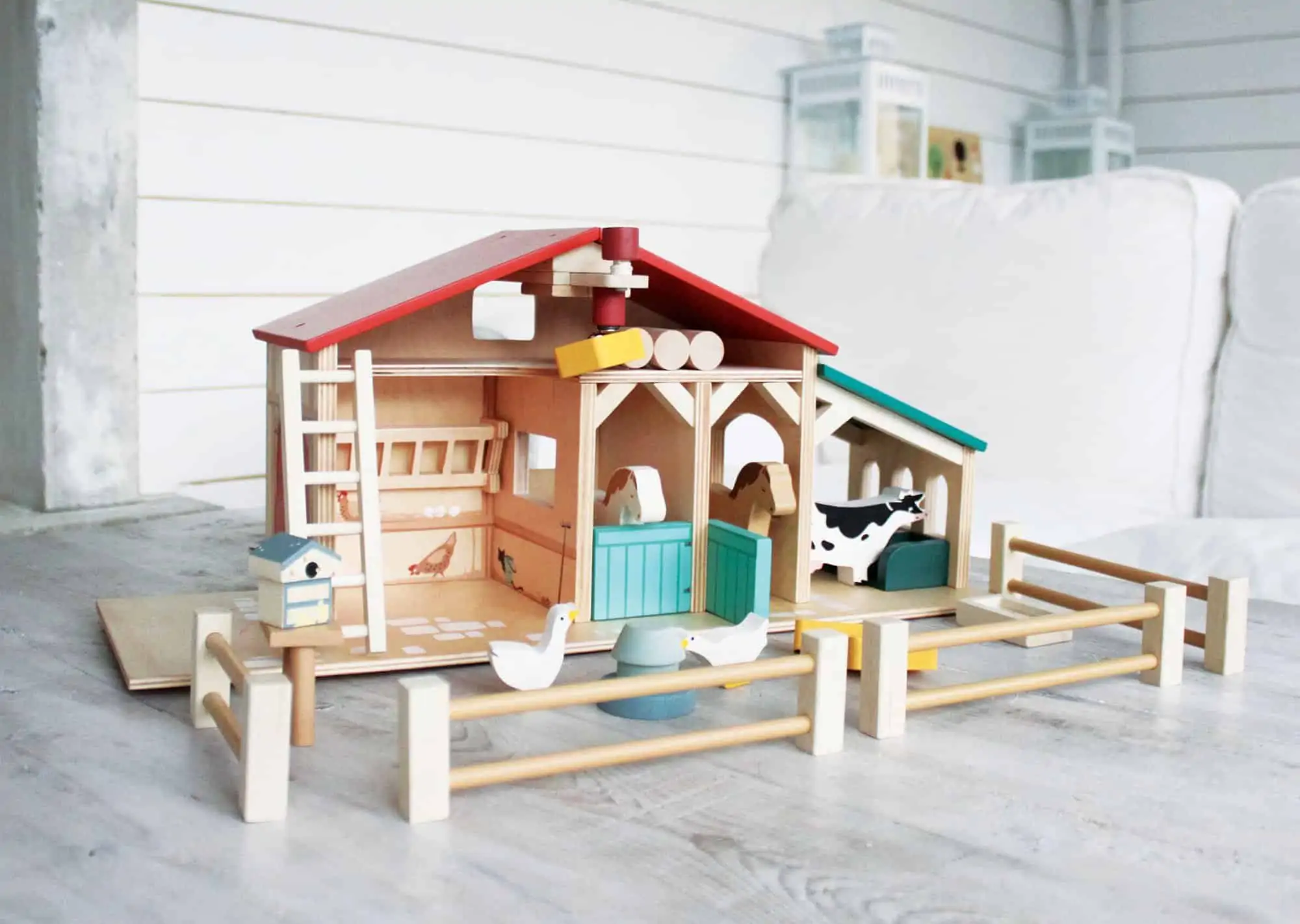 Der Tender Leaf Toys Bauernhof ist ein Rollenspielset aus Holz für Kinder ab 3 Jahren. Sein Design ist angenehm zugänglich, sodass du das Gebäude von allen Seiten bespielen kannst. Das größte Teil des Sets ist das Hauptgebäude in Form einer Scheune. Dazu gibt es natürlich passend ein Scheunentor, eine Leiter, die zum Dachboden führt, sowie ein Futtertrog. An der offenen Scheunenseite befindet sich außerdem ein kleiner Magnethaken, mit dem du die drei Heuballen nach oben heben kannst. Weiterhin enthalten sind vier Zaunteile, 2 Gänse, 2 Pferde, ein Bienenstock, ein Kuhstall und 6 Baumstämme. Der Bauernhof ist ca. 51 cm breit, 38,5 cm hoch und 22 cm tief. Das gesamte Set wiegt etwa 2,5 kg.