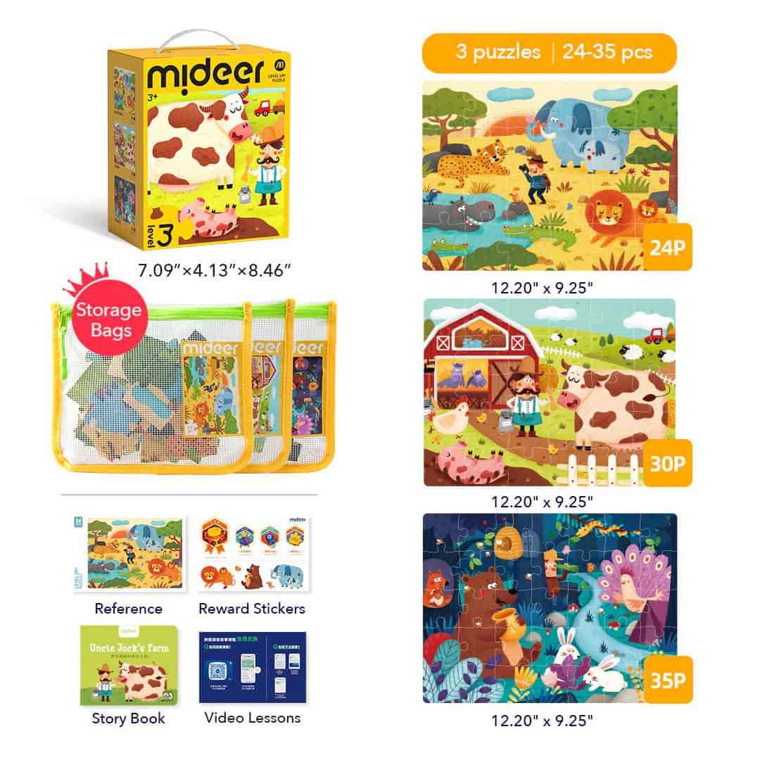 Mideer Level Up! Puzzles Level 3 bietet 3 Puzzle mit wunderschönen Naturlandschaften für Kinder ab 3 Jahren. Mit 24 bis 35 Teilen fördern sie die kognitive Entwicklung und Fantasie.