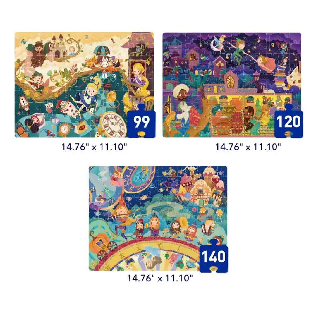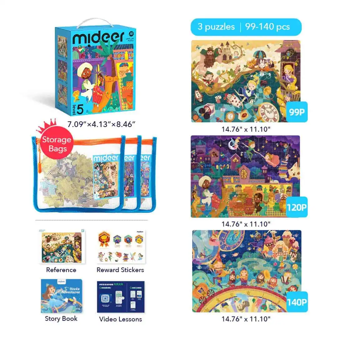 Das Mideer Puzzle-Set Level 5 „Märchenwelt“ enthält 3 Puzzles mit 99/140 Teilen, die zauberhafte Märchenwelten zeigen. Ideal für Kinder ab 4 Jahren zur Förderung von Kreativität und kognitiver Entwicklung.