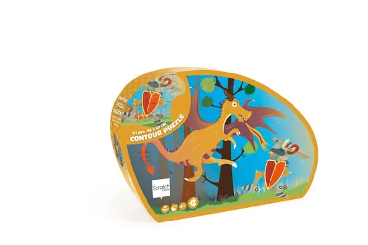 Das Shape Puzzle Drache von Scratch ist nicht rechteckig wie andere Puzzle, sondern an die Form des Motivs angepasst. Wohne dem spannenden Kampf zwischen Rittern und Drachen bei. Wer wird wohl gewinnen?. Die 61 bunten Teile sind liebevoll gestaltet und werden in einer schicken Verpackung, die der Form des Puzzles ähnelt, geliefert.