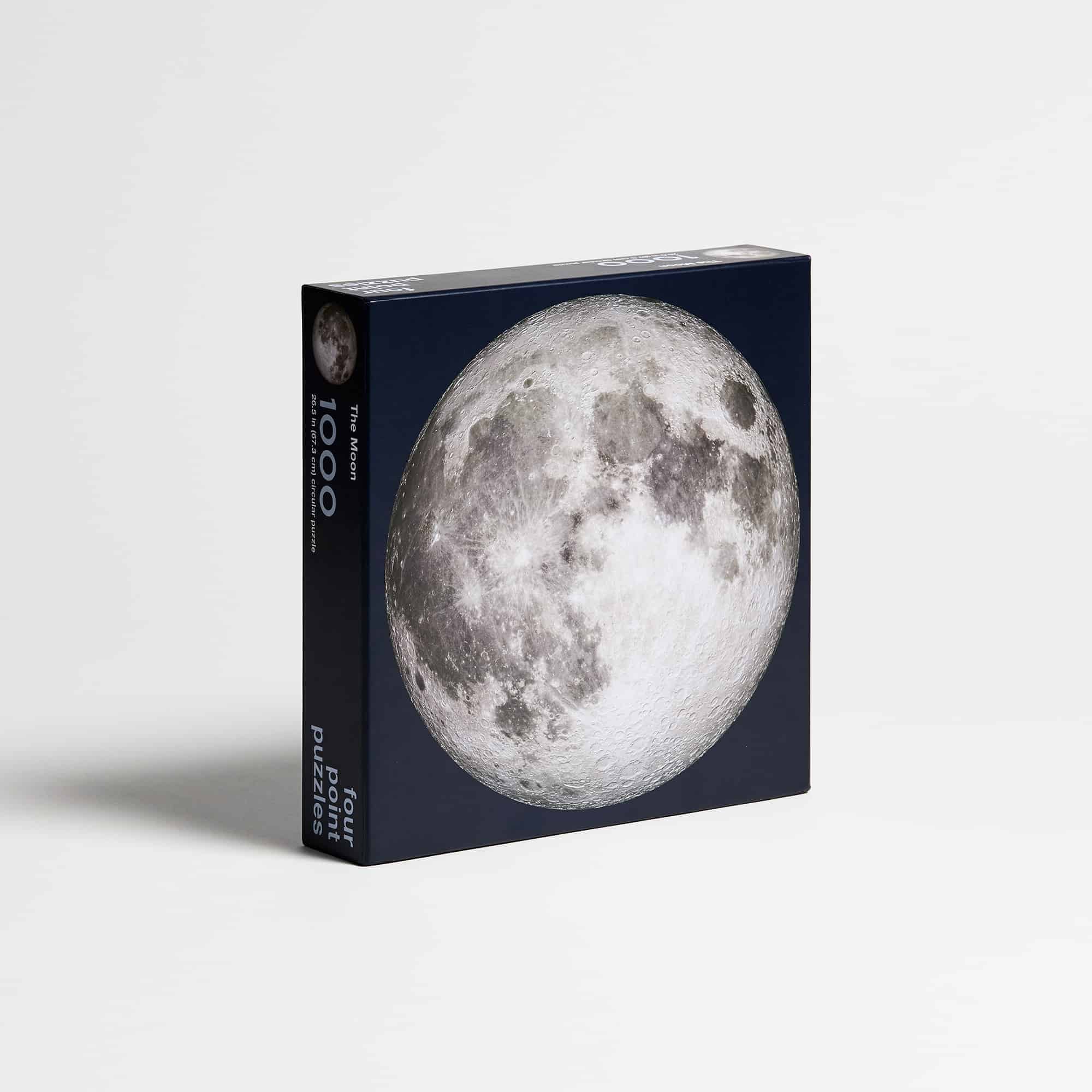 Four Point Puzzles – Der Mond ist ein 1000-teiliges, kreisförmiges Puzzle, das ein Motiv des Mondes in unglaublichem Detail zeigt. Das Bild, das von der NASA stammt, ist eines der deutlichsten Bilder der Mondoberfläche, das bisher aufgenommen werden konnte. Es zeigt selbst die kleinsten Krater in erstaunlicher Bildqualität. Obwohl das Puzzle eine Herausforderung darstellt ist gerade die Tatsache, dass keine zwei Teile die gleiche Form haben, für Puzzlefans eine wahre Freude.