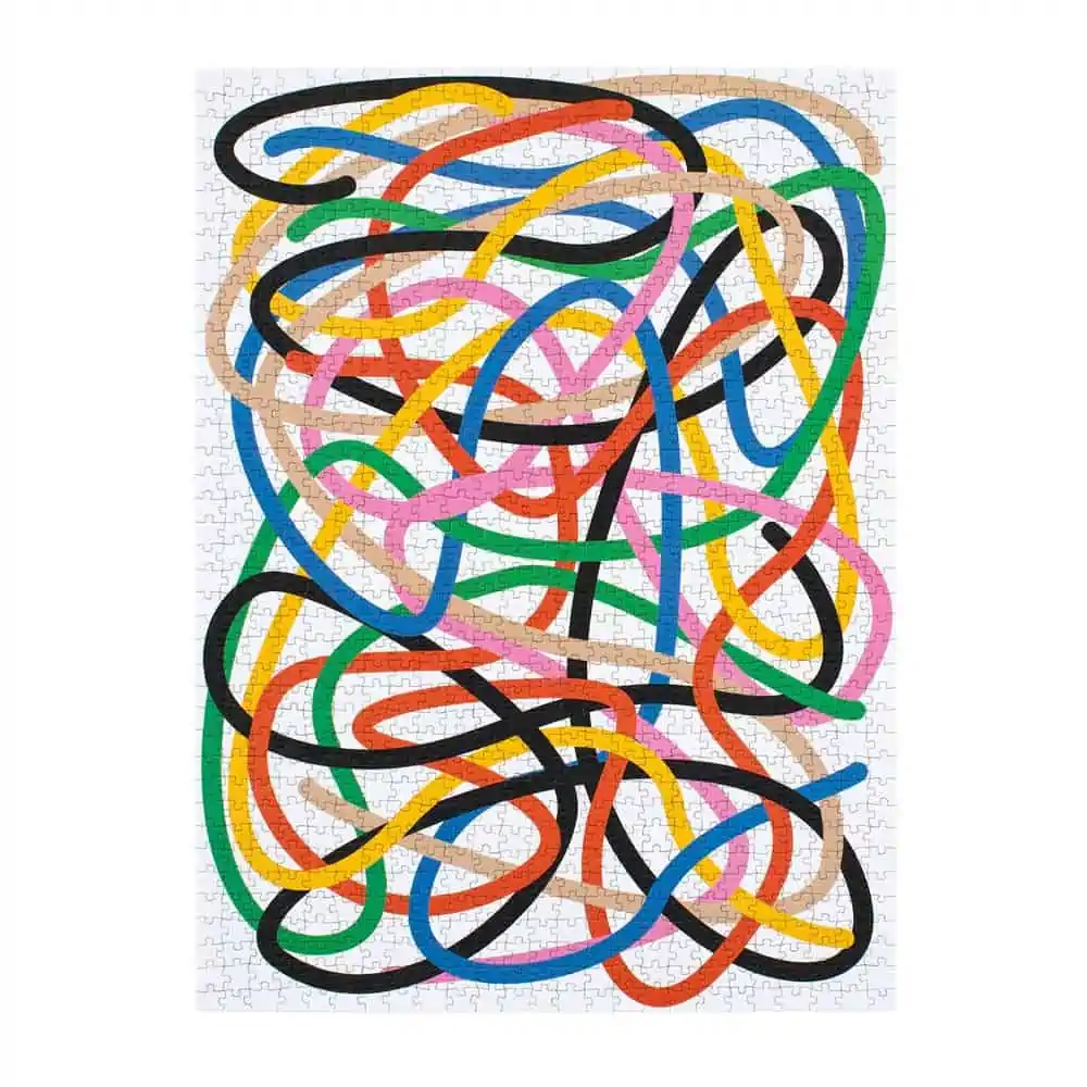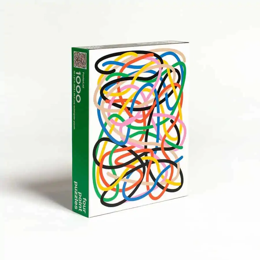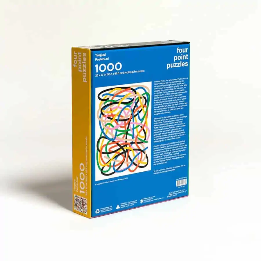 Four Point Puzzles – Tangled ist ein 1000-teiliges, rechteckiges Puzzle mit einem Motiv des Künstlers Vratislav Pecka. Der tschechische Künstler ist bekannt dafür, dass er einfache geometrische Formen und leuchtende Farben verwendet, um kühne grafische Werke zu schaffen. Dieses Puzzle zeigt Vratislavs Tangled-Illustration – ein verschlungenes Netz aus kräftigen, farbenfrohen Linien. Der Schwierigkeitsgrad dieses Puzzles ist mittelschwer bis schwer. Die Arbeit mit nur sieben Farben auf weißem Hintergrund ist eine Herausforderung. Gleichzeitig laden die verschlungenen Linien dazu ein, ihnen zu folgen, um herauszufinden, wohin sie führen.