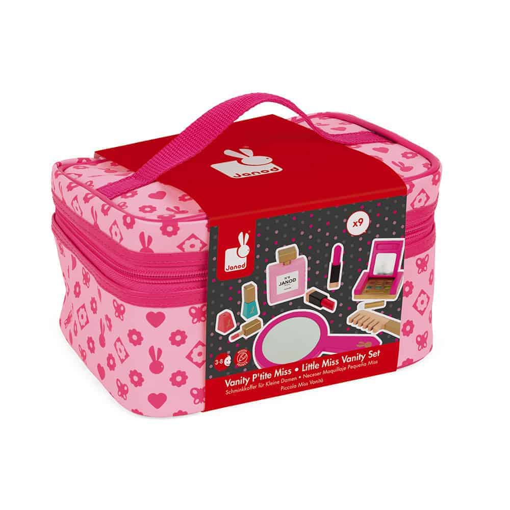 Alles, was man braucht, um die Schönste unter den kleinen Damen zu sein!9 Holz-Accessoires im Set enthalten : ein großer Spiegel, eine Schminkpalette mit Pinsel und integriertem Spiegel, 2 Lippenstifte, 2 Nagellacke, 1 schwarzer Kajalstift, 1 Parfümflasche, 1 Kamm. Liebevoll verpackt in einem rosafarbenen Kunststoff-Koffer.