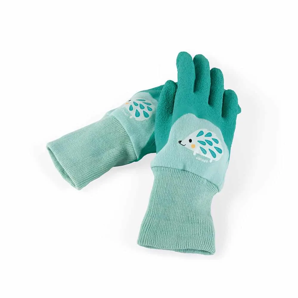 Spielzeug für das Spiel im Garten und/oder an der freien Luft. Das Set besteht aus einer Gießkanne, einem Paar Handschuhe, einem kleinen Rechen und einer kleinen Schaufel. In fröhlicher hell-grüner Farbe. Werkzeuge aus Metall und massivem Holz.