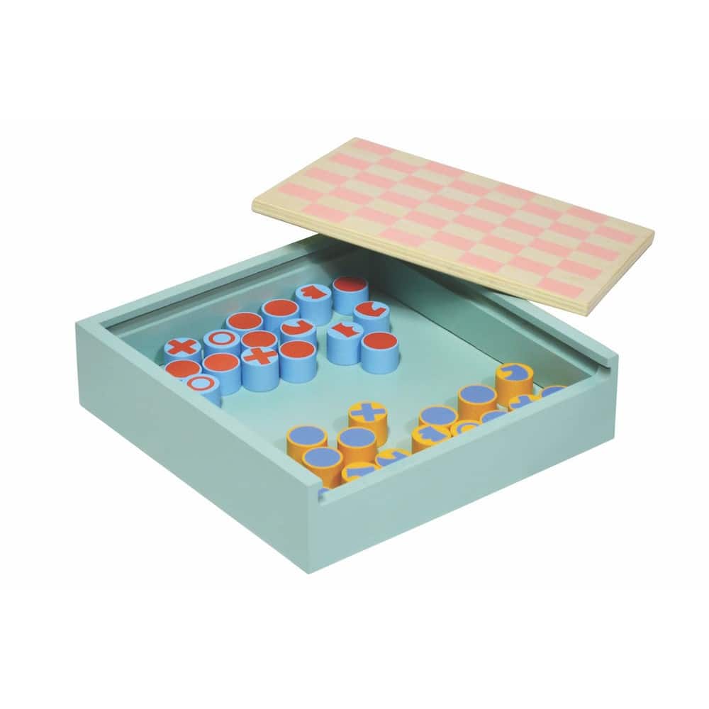 Vielseitiges Schach- und Dame-Set mit umdrehbarem Designbrett aus nachhaltigem Gummibaum. Ideal für Kinder ab 5 Jahren. Kreiert von Designerin Panisa Khunprasert.