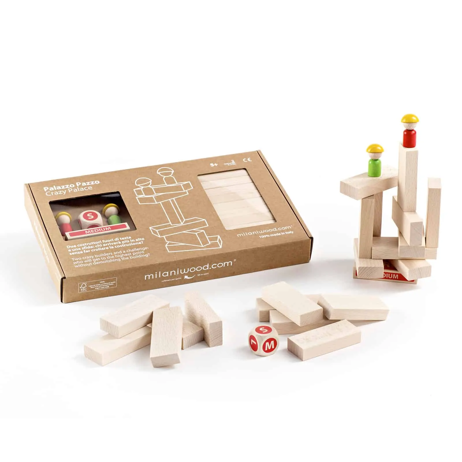 Milaniwood Crazy Palace ist ein kreatives und kompetitives Bauspiel für 2 Spieler ab 5 Jahren, bei dem Strategie, Taktik und eine ruhige Hand gefragt sind. Platziere deine Bausteine so auf dem Sockel, wie es der Würfel vorgibt. Der Spieler, dessen Spielfigur am Ende höher steht, gewinnt. Aber Vorsicht: Wirfst du die Spielfigur deines Gegners um, hast du verloren! Du musst also nicht nur taktisch klug, sondern auch geschickt vorgehen. Inkl. Spielanleitung.