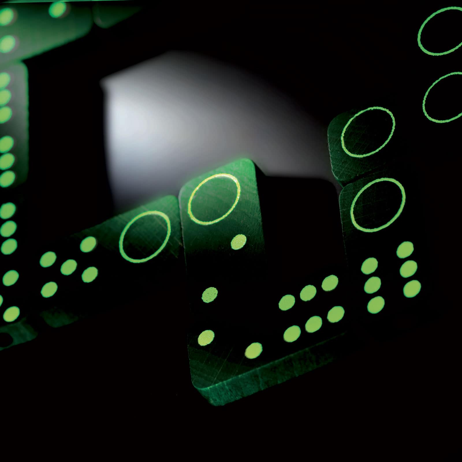 Nutze die Spielfiguren um klassisches Domino zu zweit, zu dritt oder zu viert zu spielen. Dabei kannst du sogar das Licht dimmen, denn die Punkte auf den Dominosteinen leuchten im Dunkeln (du musst sie allerdings vorher Sonnenlicht ausgesetzt haben). Du hast keinen Partner zum Spielen? Kein Problem! Nutze die Dominos, sowie die enthaltenen Stängel und Blüten, um deinen eigenen Strauß Tulpen zu erschaffen. Wenn du die Tulpen im Ständer ins Sonnenlicht stellst, leuchten die Punkte auf den Dominosteinen im Dunkeln auf.