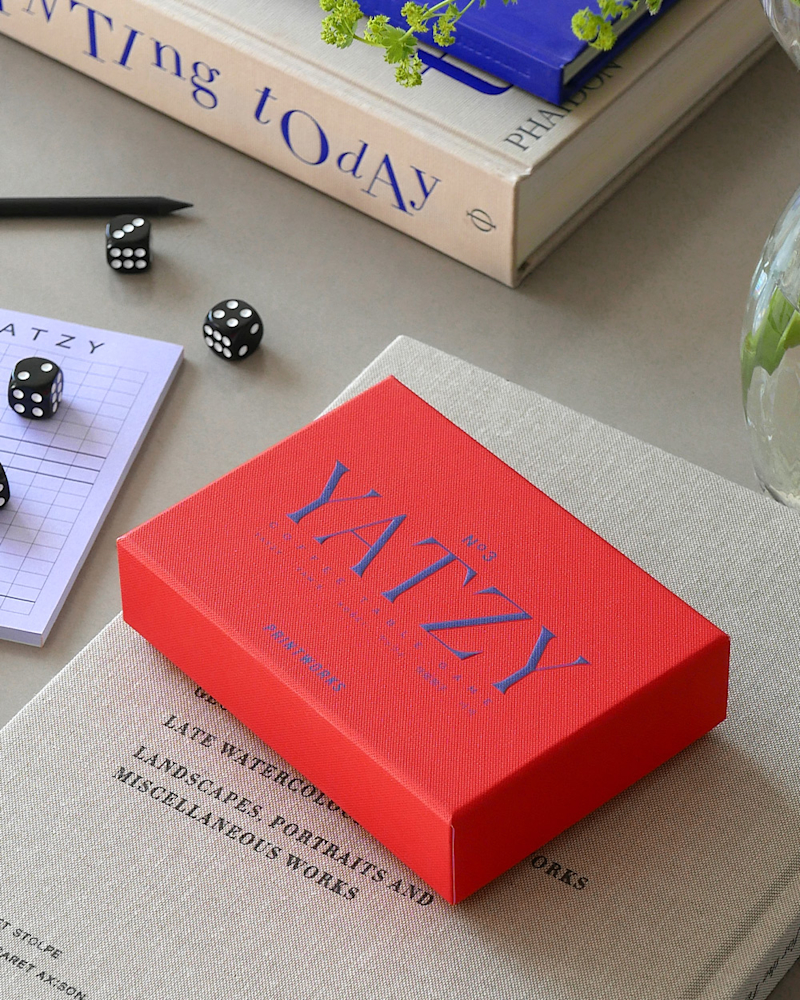 Modernes Yatzy Classic: 5 schwarze Würfel, 2 schwarze Bleistifte, 50-seitiger Spielblock in Design-Box (15,5×4×11 cm, 0,3 kg). Anleitung EN/FR/DE – schnell erklärt, sofort spielbar.