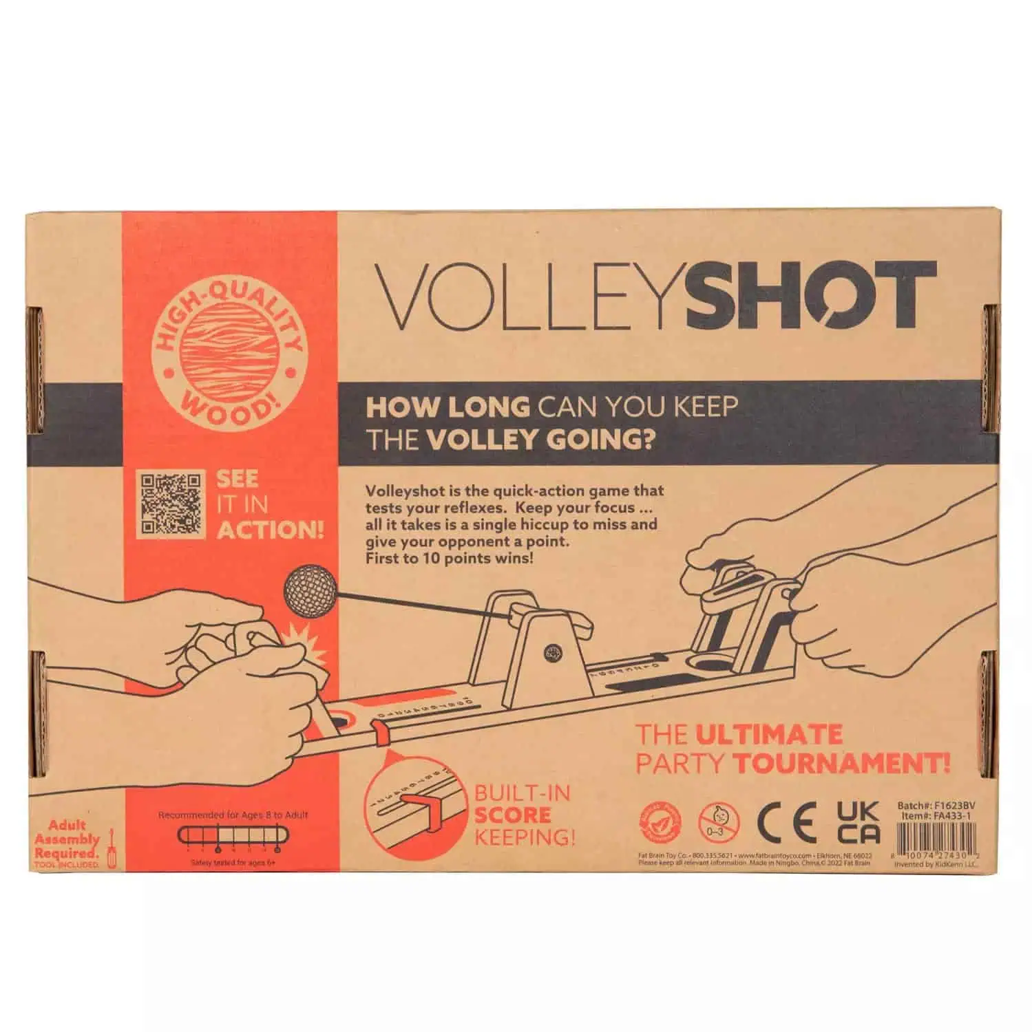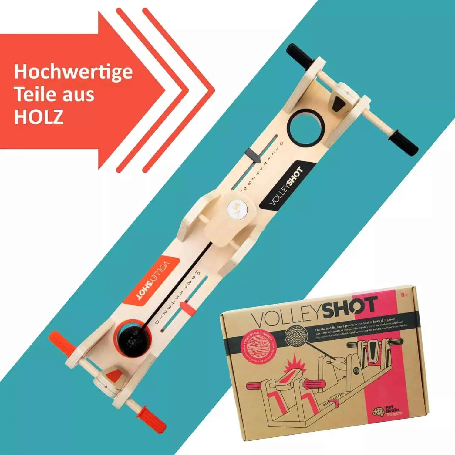 Mit dem Fat Brain Toys VolleyShot treten zwei Spieler gegeneinander an: Jeder nutzt ein Paddel, um den Ball „hin und her“ zu schlagen — wer verfehlt, bekommt einen Punkt. Das Spiel enthält zwei Holzpaddel, einen Ball und integrierte Punkteschieber. Gefertigt aus Massivholz mit hochwertiger Verarbeitung, bringt es Spaß für Kinder und Erwachsene. Empfohlen für Kinder ab ca. 8 Jahren.