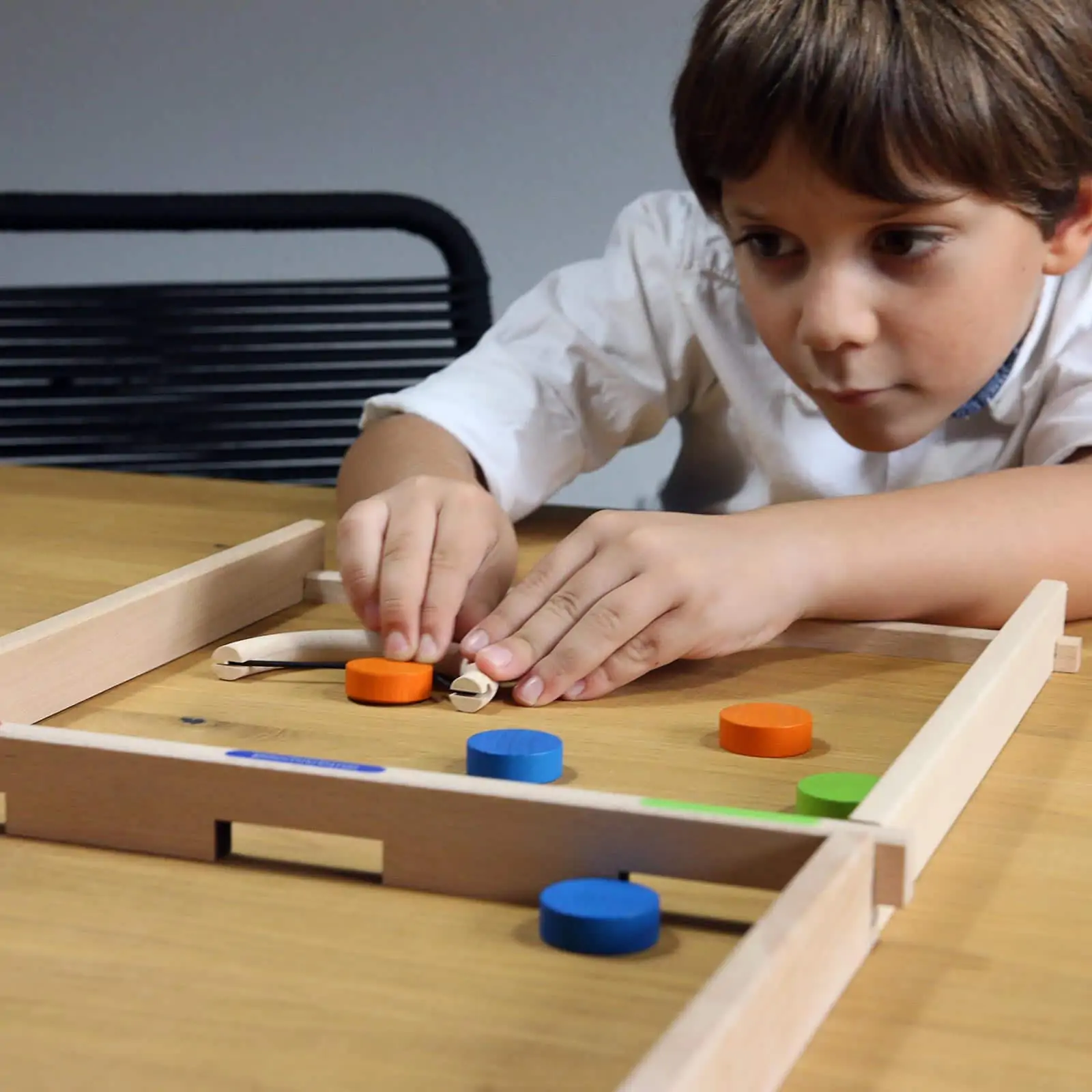 Schnelles Geschicklichkeitsspiel für 2 Spieler ab 5 Jahren. Befördere deine Scheiben auf die Seite des Gegners.