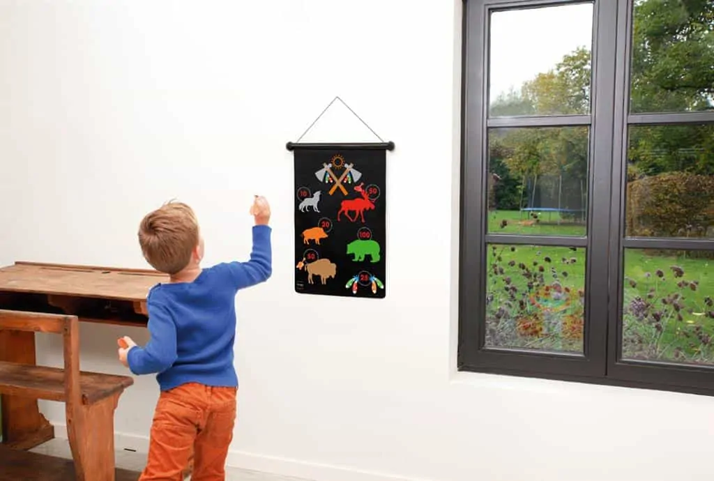 Die magnetische Matte im Wild-West-Design kann beidseitig aufgehangen werden. Die Zielscheibe auf der einen Seite ist in ihrem Layout einer echten Dartscheibe ähnlich, wobei die Werte stark vereinfacht sind. Auf der anderen Seite gilt es, die mit Punktzahlen versehenen Kreise zu treffen.