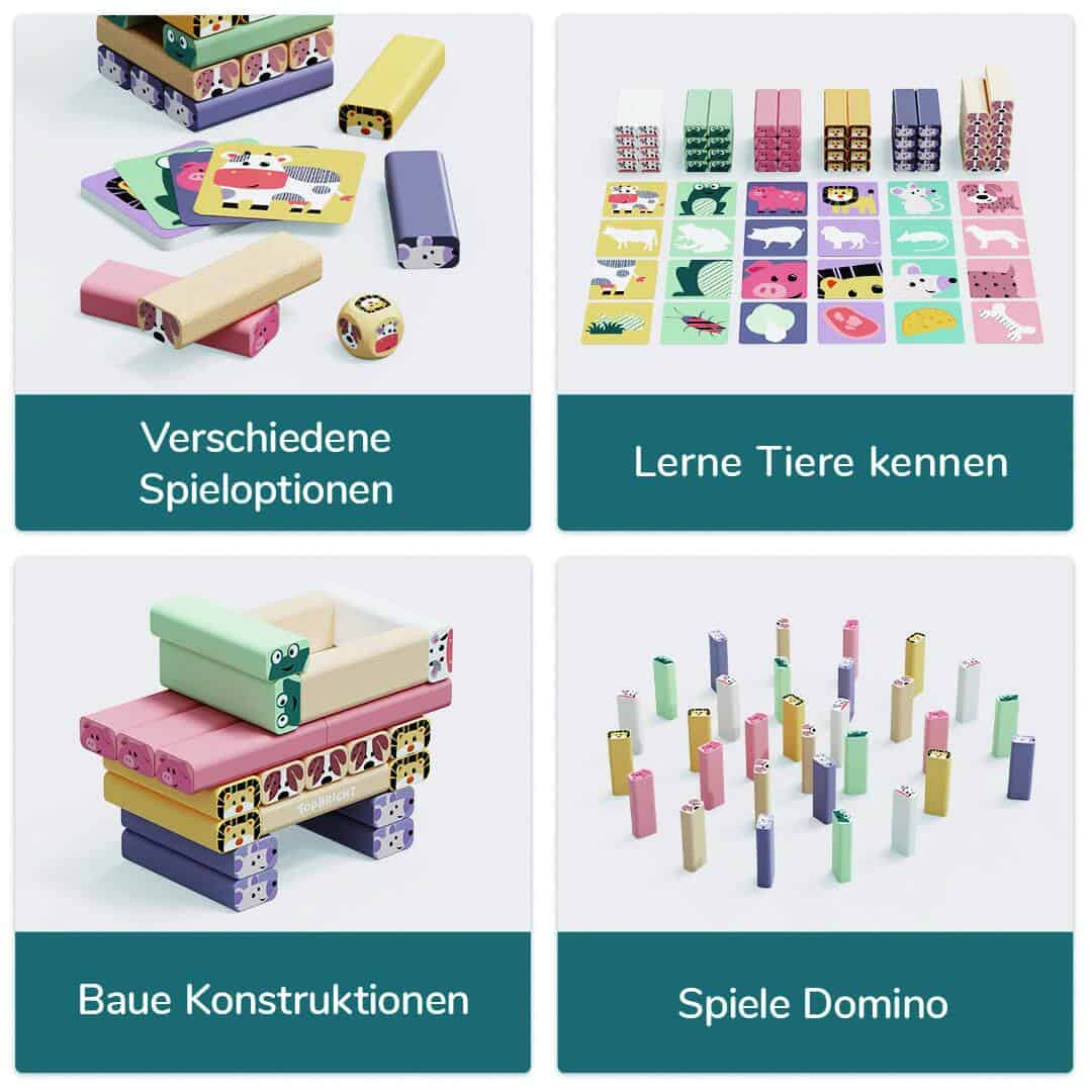Lustiger Wackelturm mit Tiermotiven – stapeln, bauen, dominieren! 3-in-1 Spielspaß aus Holz mit Würfel & Karten. Fördert Geschicklichkeit & Fantasie ab 3 Jahren.