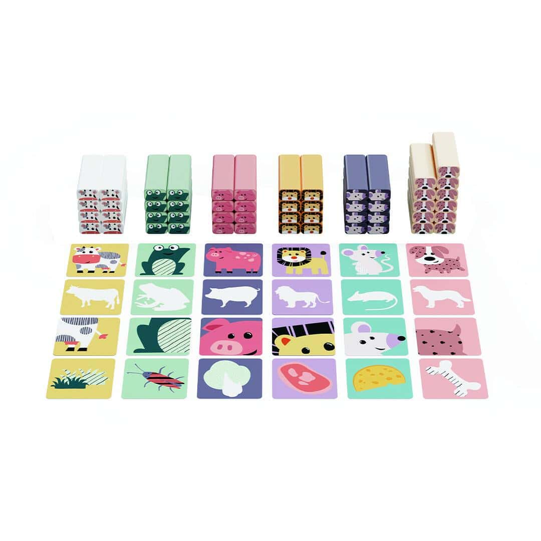 Inhalt: 51 farbige Holzklötzchen mit Tiermotiven, 1 Holzwürfel, 24 Spielkarten
