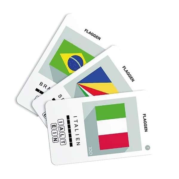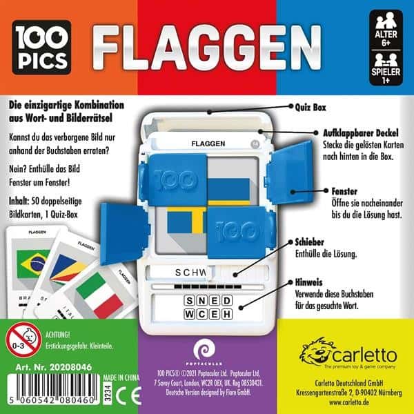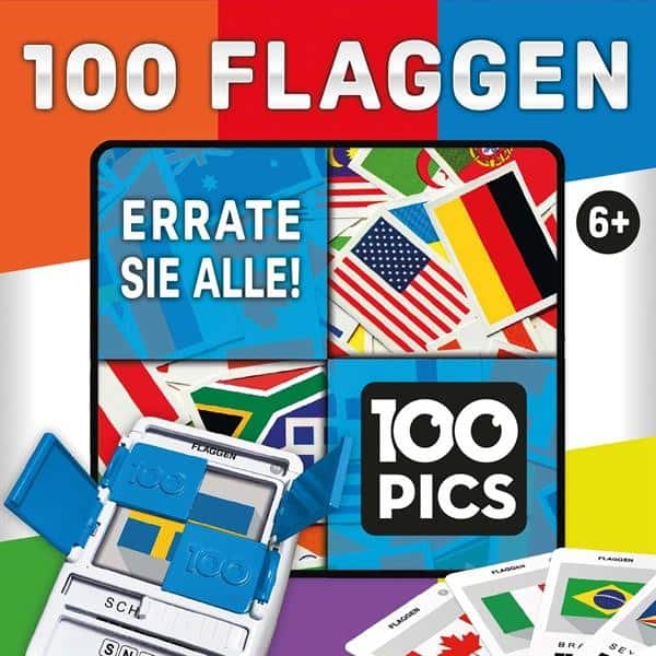 Kennst du die Flaggen der Welt? 100 Länderflaggen aus allen Kontinenten warten im 100 PICS Bilderrätsel darauf, dass du sie errätst. Reicht die Buchstabenkombination oder brauchst du einen oder mehrere Bildausschnitte? Kannst du alle 100 Flaggen erraten? 100 PICS ist die clevere Kombination aus Wort- und Bilderrätsel, verpackt in der einzigartigen Quiz-Box. Die Spieler müssen 100 Bildkarten nur anhand von Buchstabenkombinationen oder mit verborgenen Bildinformationen erraten. Der integrierte Schieber enthüllt nach und nach die Lösung. Die geniale Quiz-Box mit vier aufklappbaren Fenstern ist kompakt, praktisch und bietet viele Spiel-Möglichkeiten.
