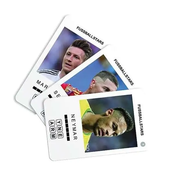 Bilderrätsel zum Thema Fußballer mit 100 Karten. Inklusive Schieber mit Fenstern zum schrittweise Enthüllen der Lösung. Für einen oder mehr Spieler.