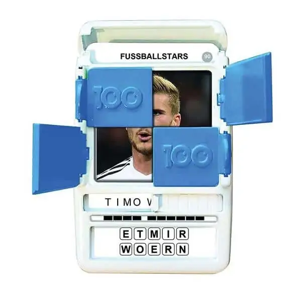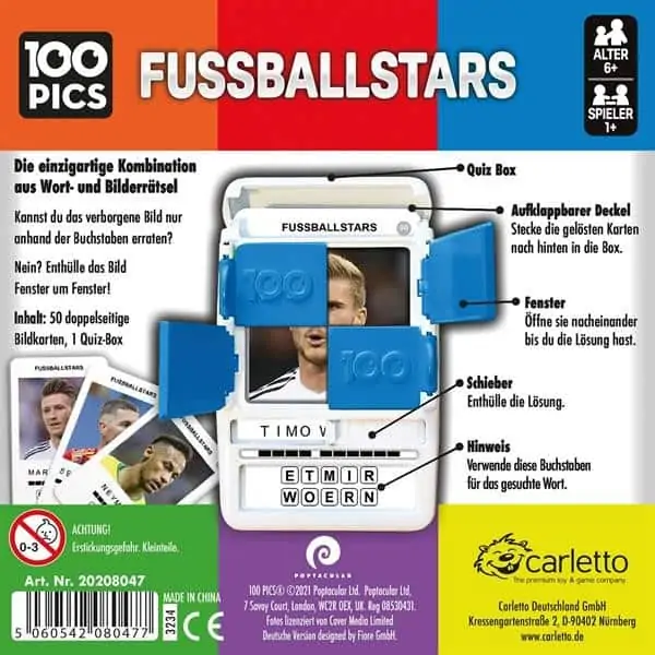 Kennst du die größten Fußballstars unserer Zeit? Erkennst du im 100 PICS Bilderrätsel die 100 Top-Fußballer aus den erfolgreichsten Ligen der Welt? Reicht dir die Buchstaben Kombination oder brauchst du einen oder mehrere Bildausschnitte. Kannst du alle 100 Fußballstars erraten? 100 PICS ist die clevere Kombination aus Wort- und Bilderrätsel, verpackt in der einzigartigen Quiz-Box. Die Spieler müssen 100 Bildkarten nur anhand von Buchstabenkombinationen oder mit verborgenen Bildinformationen erraten. Der integrierte Schieber enthüllt nach und nach die Lösung. Die geniale Quiz-Box mit vier aufklappbaren Fenstern ist kompakt, praktisch und bietet viele Spiel-Möglichkeiten.