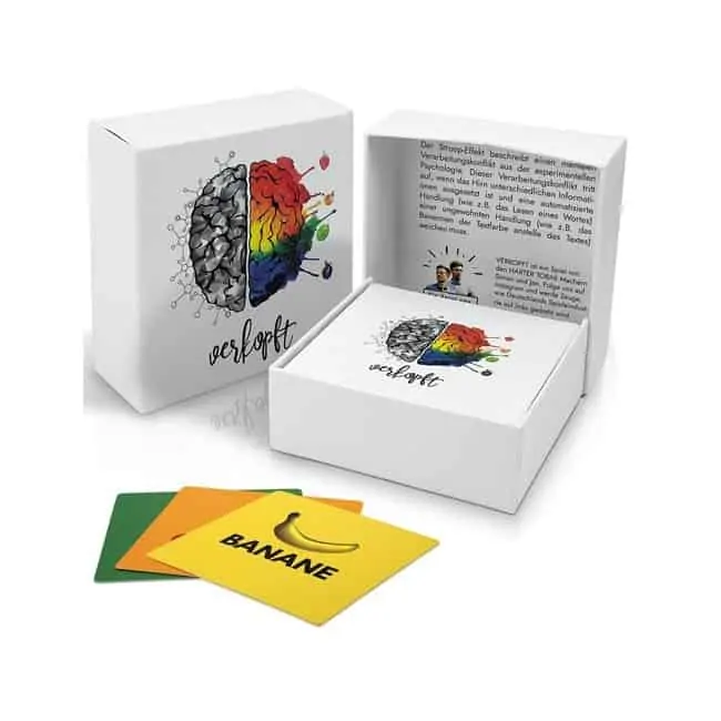 Verkopft ist ein Kartenspiel, in dem es darum geht als erster Spieler alle Handkarten loszuwerden. Hierfür muss man lediglich die Hintergrundfarbe, die Textfarbe oder die auf der Karte abgebildete Frucht richtig benennen. Klingt machbar, oder? Jetzt stell dir vor auf der Karte befindet sich eine Banane auf grünem Hintergrund, begleitet vom Wort „Lila“ in roter Schrift. Du hast 3 Sekunden Zeit, um dieses verkopfte Wirrwarr an Informationen zu verarbeiten und die korrekte Antwort zu geben. Viel Spaß!