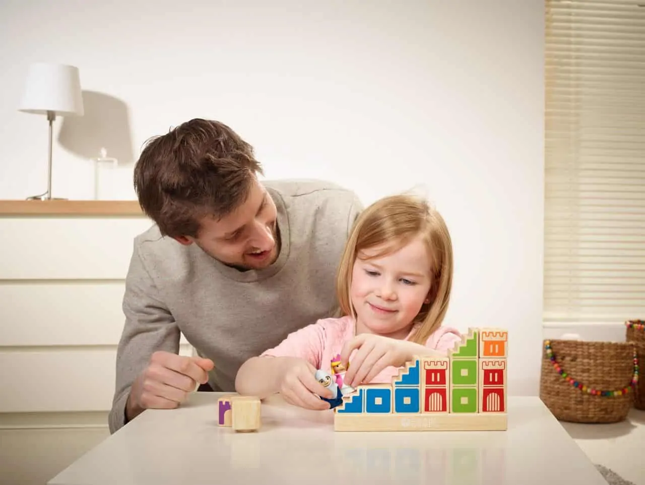 SmartGames Camelot Jr. ist ein romantisches 3D-Knobelspiel für Kinder ab 4 Jahren. Kombiniere die Bauteile und bringe den Ritter und die Prinzessin wieder zusammen. Das Set besteht aus einer Holzbasis, verschieden farbigen Türmen, 3 Treppen sowie zwei Holzfiguren, Ritter und Prinzessin. Ebenfalls enthalten ist ein Aufgabenheft mit 48 Aufgaben in 4 Schwierigkeitsgraden. Mit diesem Denkspiel verbessert du dein logisches Denken, dein Vorstellungsvermögen und deine Fähigkeit, Probleme zu lösen.