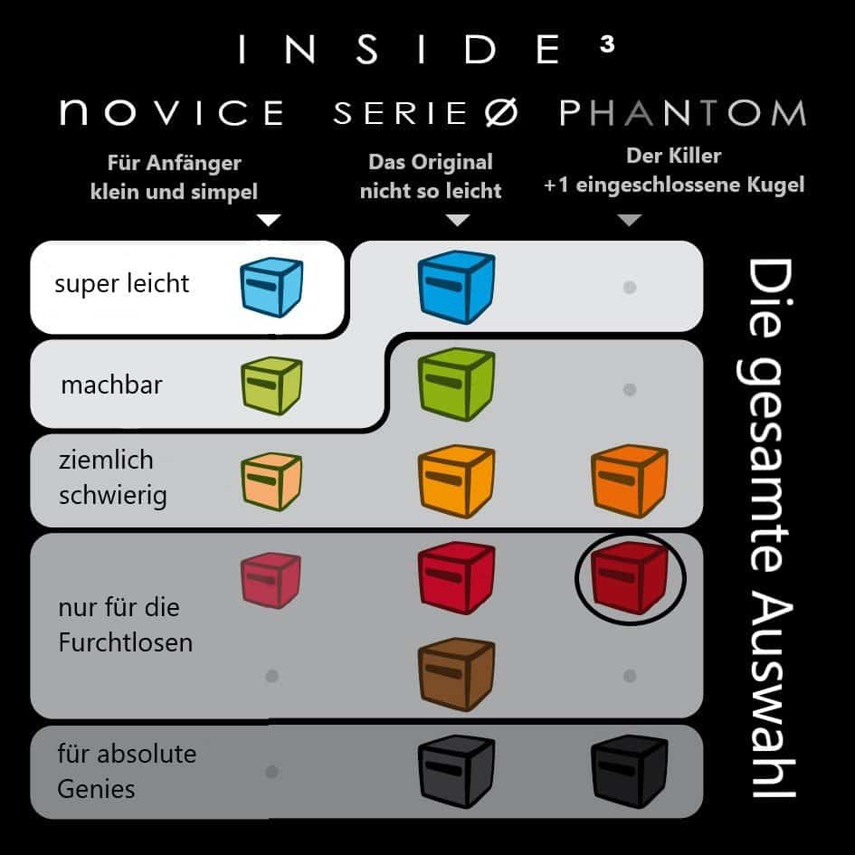 Die Inside³ Reihe enthält 12 Schwierigkeitsstufen in 3 unterschiedlichen Serien, von kinderleicht bis wahnsinnig schwer.