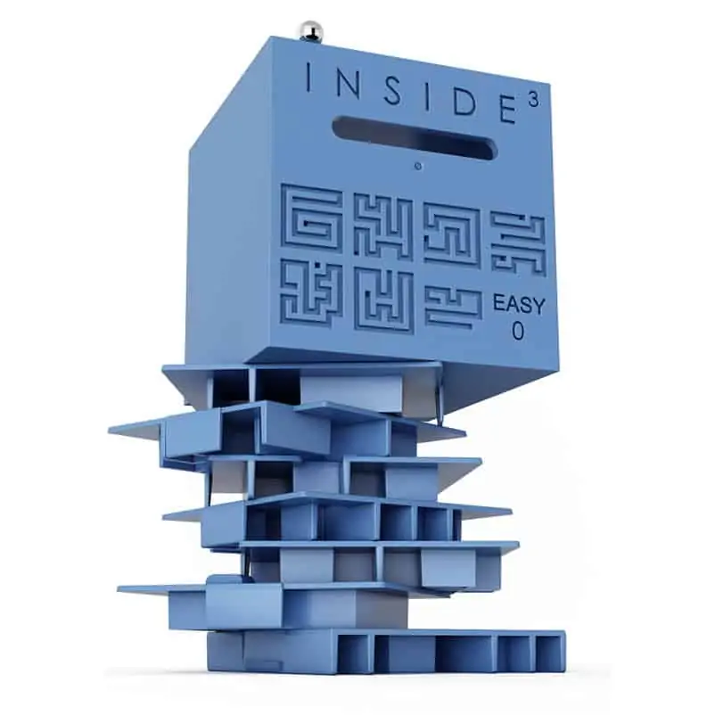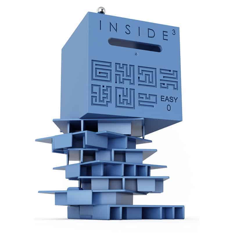INSIDE3 sind 3D-Labyrinthe im Würfel: Die Kugel verschwindet im Dunkeln – und ihr führt sie durch mehrere Ebenen bis zum Ausgang. Je nach Reihe variieren Größe, Ebenenzahl und Schwierigkeitsgrad; einige Modelle lassen sich öffnen, die härtesten bleiben versiegelt.