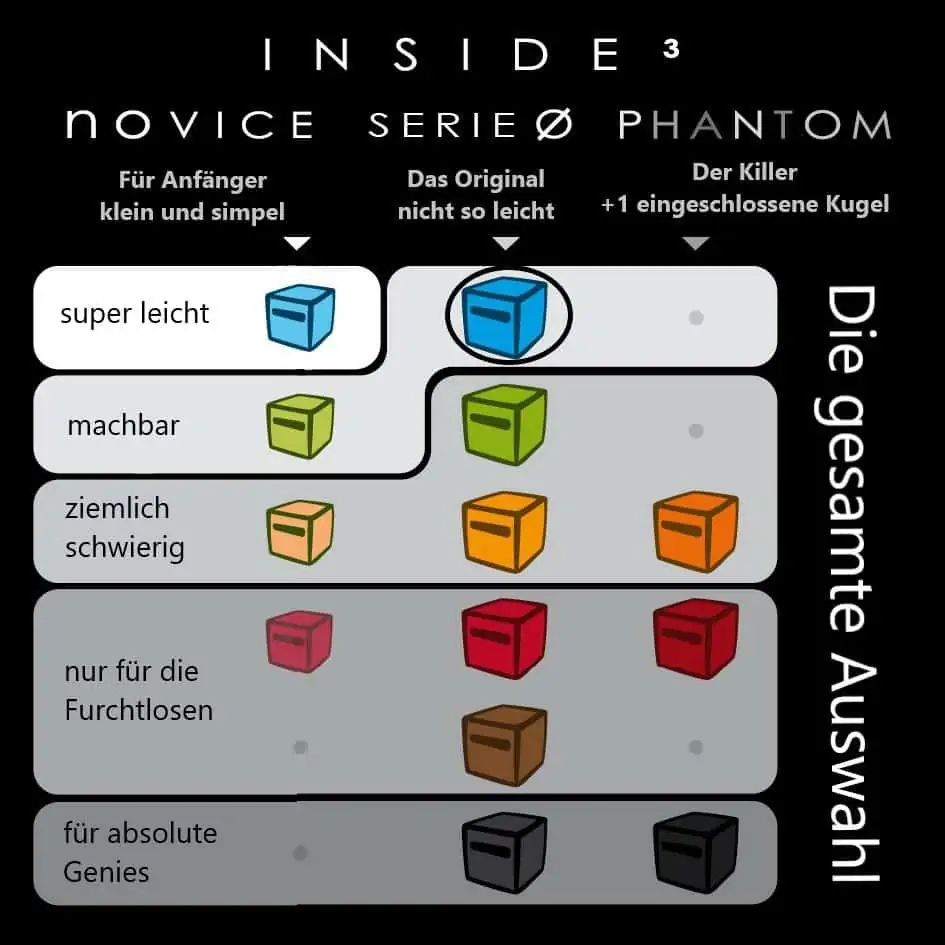 Die Inside³ Reihe enthält 12 Schwierigkeitsstufen in 3 unterschiedlichen Serien, von kinderleicht bis wahnsinnig schwer.