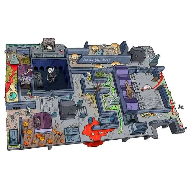 4 Krypten sind verschüttet in den Kellern des Friedhofs – 4 Möglichkeiten dich zu verlaufen. Glücklicherweise sind vor jeder Krypta Pläne eingraviert, die dir helfen werden, das Licht zu erreichen. Sie werden außerdem sehr hilfreich sein, um die Anlage wieder zu verlassen, siegreich und befreit von dem für immer verfluchten Friedhof. Ob du die Abkürzungen und geheimen Gänge entdeckst liegt ganz an dir und deinen Fähigkeiten als Vampirjäger.