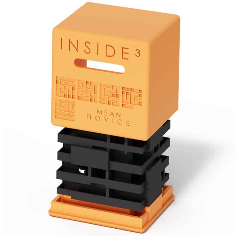 INSIDE3 sind 3D-Labyrinthe im Würfel: Die Kugel verschwindet im Dunkeln – und ihr führt sie durch mehrere Ebenen bis zum Ausgang. Je nach Reihe variieren Größe, Ebenenzahl und Schwierigkeitsgrad; einige Modelle lassen sich öffnen, die härtesten bleiben versiegelt.