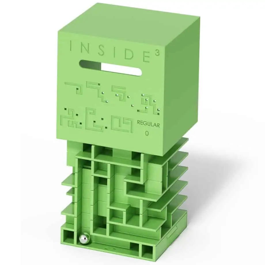 INSIDE3 sind 3D-Labyrinthe im Würfel: Die Kugel verschwindet im Dunkeln – und ihr führt sie durch mehrere Ebenen bis zum Ausgang. Je nach Reihe variieren Größe, Ebenenzahl und Schwierigkeitsgrad; einige Modelle lassen sich öffnen, die härtesten bleiben versiegelt.